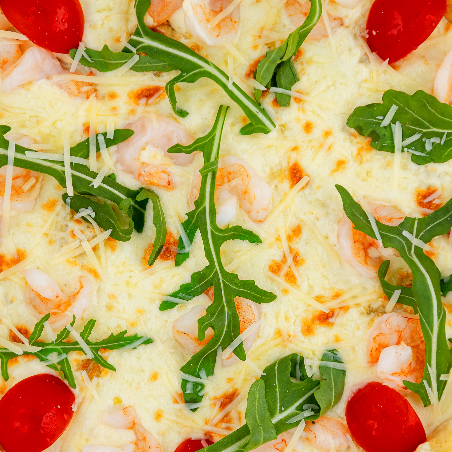 Тесто (мука, дрожжий, соль, сахар, вода, масло оливковое), соус цезарь (майонез, анчоусы, каперсы, хрен, горчица), моцарелла, креветки, черри, пармезан, рукола.