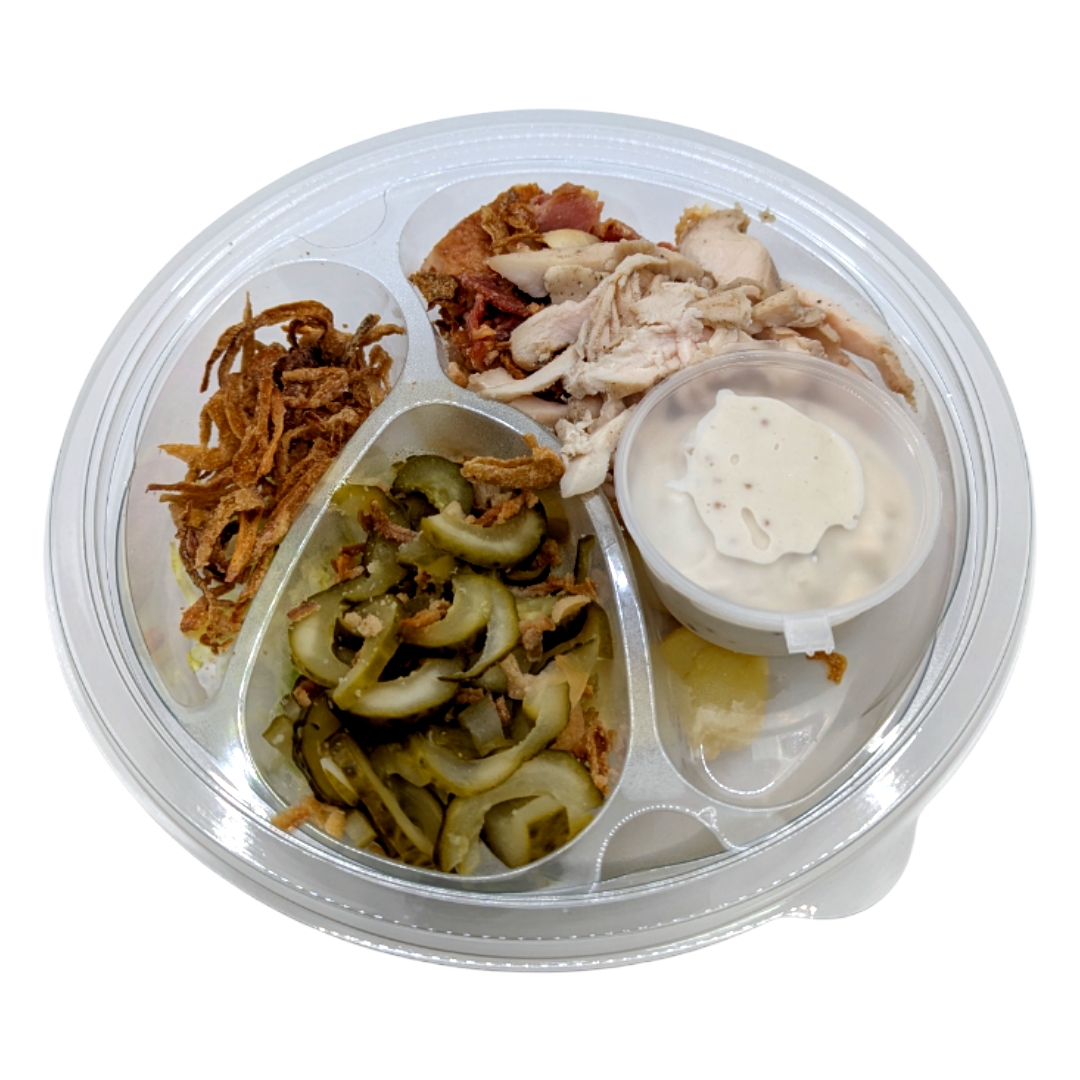 Куриное филе, огурец маринованый, бекон с/к, капуста пекинская, лук жареный, картофель, горчица зерновая, горчица, чеснок, соевый соус, майонез. Условия хранения: t +2+4. Пищевая ценность 100 г продукта: б - 8,0 г, ж - 23,0 г, у - 7,0 г, кал - 272 ккал/ 1139 кДж.