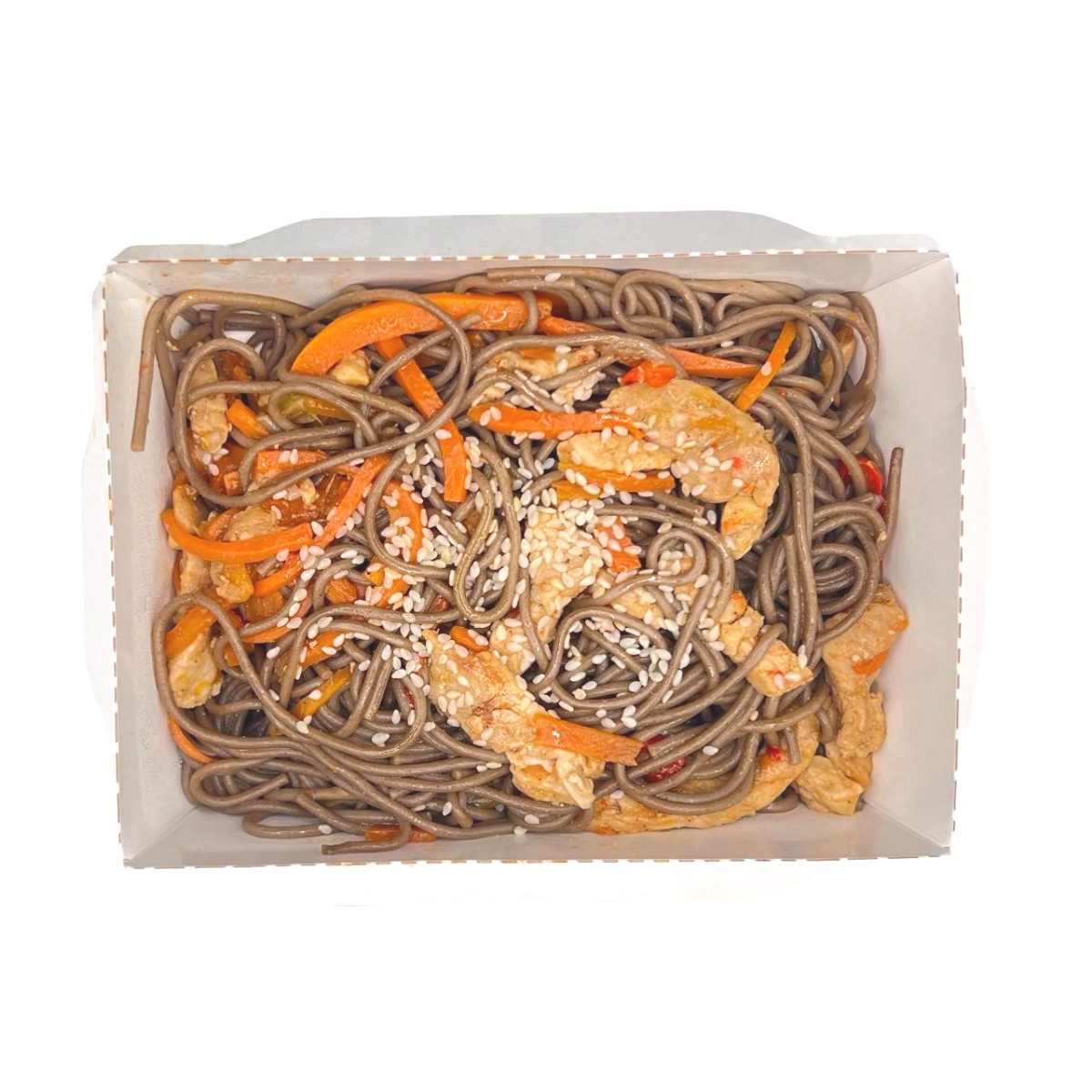 Изысканное блюдо японской кухни, где лапша соба гармонично сочетается с сочными кусочками свинины и свежими овощами. Наш шеф мастерски приготовил это блюдо, сохранив аутентичный вкус и питательные свойства всех ингредиентов. Сбалансированный соус подчеркивает натуральный вкус продуктов, а особая техника обжарки придает мясу нежность, а овощам — приятную текстуру.