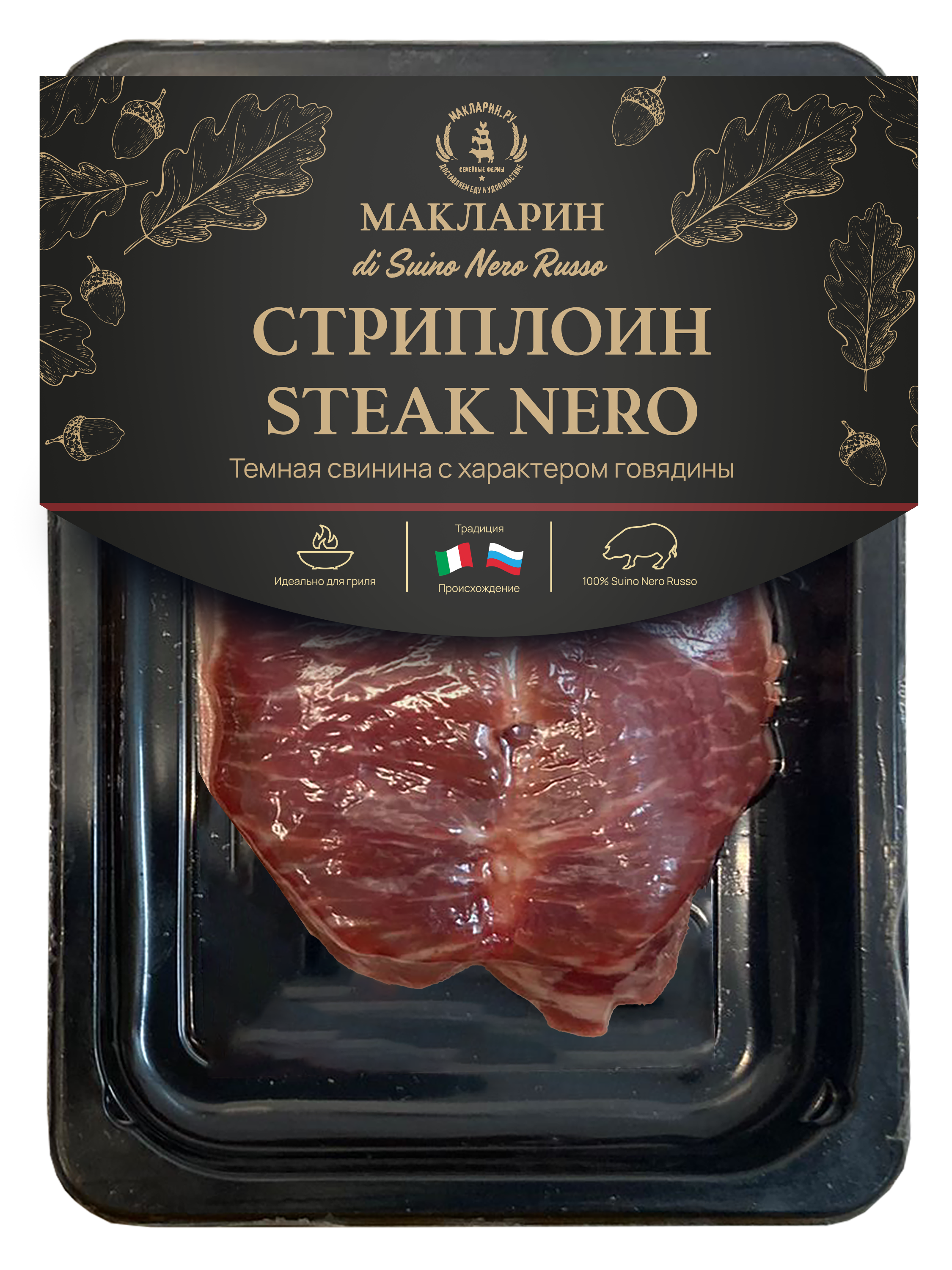 Стриплойн из свинины Suino Nero Russo — благородный отруб с выразительной текстурой и глубоким вкусом. Уникальный союз венгерской мангалицы и дикого кабана придаёт мясу природную мраморность, плотность и насыщенный аромат с лёгкими нотами дичи.